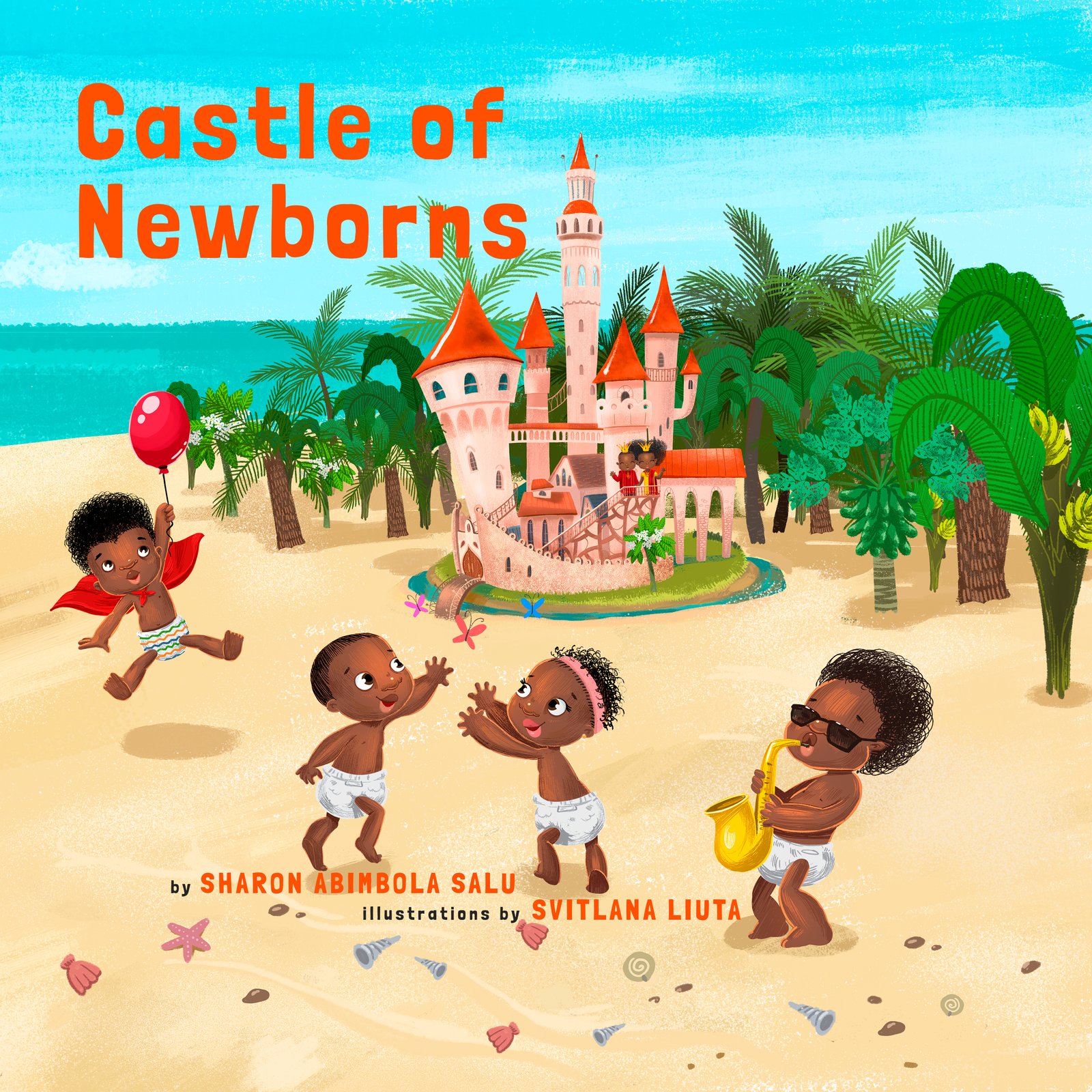 Castle of Newborns African Childrens Book front cover, featuring beautiful black babies playing on the beach on an island. A picture book that celebrates the art of storytelling and bedtime rituals. A humorous take on “Where do babies come from?”