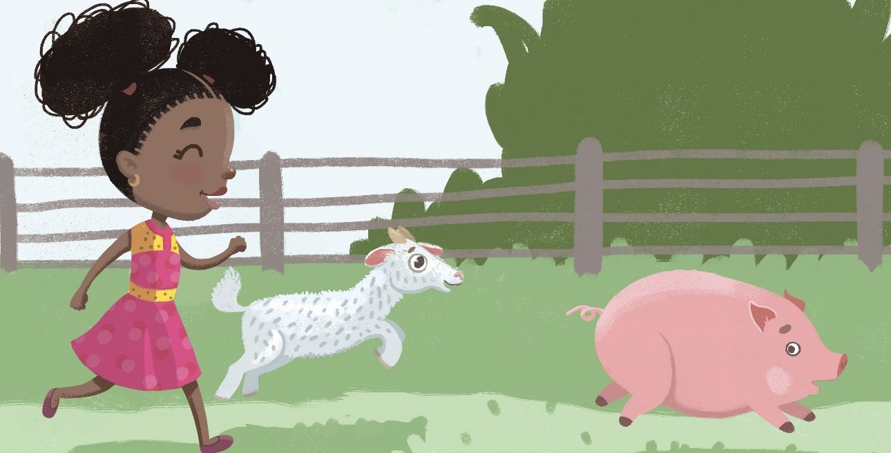 Mofolusho and Curry the goat chase a pig in A Goat Called Curry, one of several African Childrens Books